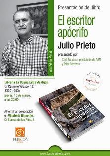 El jueves 15 de marzo a las 20:00 horas el escritor plasentino, afincado en Gijón, Julio Prieto acompañado por Covi Sánchez y Pilar Ferreras, presentará su nuevo libro El escritor apócrifo en la librería La Buena Letra.