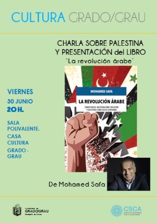 La Casa de Cultura de Grado/Grau acogerá este viernes 30 de junio, a partir de las 20:00 horas, una charla sobre Palestina y la presentación del libro La revolución árabe. Democracia, nacionalismo, religión y Palestina como nudo gordiano (Hoja de Lata Editorial, 2017), del activista y escritor de origen palestino Mohamed Safa. La presentación correrá a cargo del Concejal de Cultura, Plácido Rodríguez.