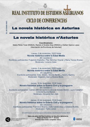 Durante el mes noviembre tendrá lugar el ciclo de conferencias “La novela histórica en Asturias / La novela histórica n’Asturies“, organizado por el RIDEA en colaboración con la Asociación de Escritores y escritoras de Asturias (AEA) y actuando como coordinadores Marta Pérez Toral, Ramón d’Andrés Díaz y Esther García López. Las charlas se celebrarán en el Salón de Actos del Real Instituto de Estudios Asturianos a las 19:oo horas.
