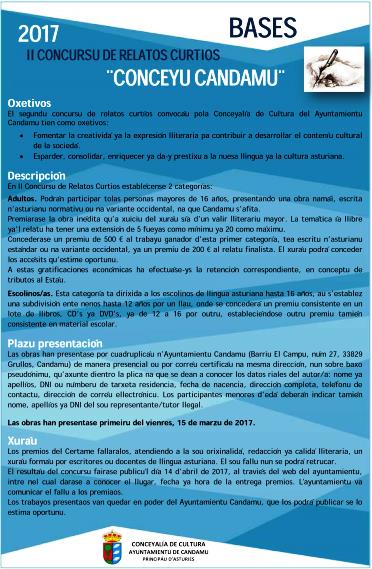 La Conceyalía de Cultura del Conceyu de Candamu acaba de convocar el segundu concursu de rellatos curtios colos oxetivos de fomentar la creatividá y la espresión lliteraria pa contribuir a desarrollar el conteníu cultural de la sociedá y esparder, consolidar, enriquecer y da-y prestixu a la nuestra llingua y a la cultura asturiana. El plazu de presentación de los orixinales va tar abiertu hasta’l 15 de marzu del 2017.