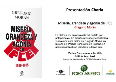 El martes 7 de noviembre a las 20:00 horas en el Edificio Pavo Real (Campo San Francisco, Oviedo), organizada por Foro Abierto tendrá lugar la presentación del libro Miseria, grandeza y agonía del PCE de Gregorio Morán. El autor estará acompañado del periodista Xuan Cándamo y del economista José Feito.