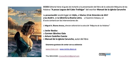 El martes 19 de diciembre a las 20:00 horas en la librería La Buena Letra de Gijón se presentará el libro A pocas leguas del Cabo Trafalgar cuyo autor es Manuel de la Iglesia-Caruncho. En el acto participarán  además del autor Miguel Angel Alvarez Areces, director de la colección “Máquina de las Palabras”, Javier Bauluz, Carmen Sánchez Gaia y Arturo Casielles Cuesta.