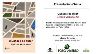 El martes 12 de septiembre a las 19:00 horas en la librería Cervantes tendrá lugar la presentación de Ciudades de autor de José Luis García Martín. El acto será presentado por el poeta Pablo Núñez, codirector de la revista Anáfora.