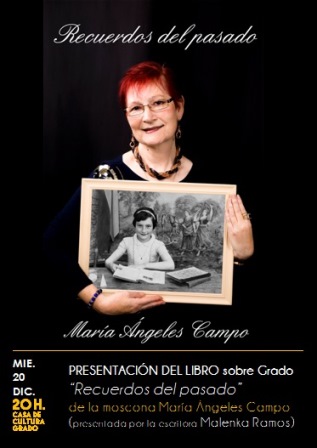 El miércoles 20 de diciembre a las 20:00 horas en la Casa de Cultura de Grado tendrá lugar la presentación del libro Recuerdos del pasado de la moscona María Ángeles Campo. Presentará el acto la escritora Malenka Ramos.