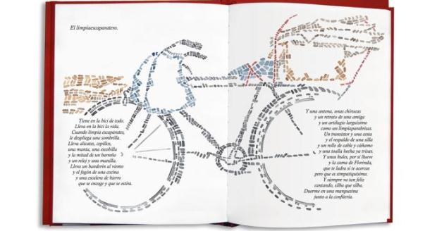 Cada poema es acompañado por una ilustración de la que forman parte los propios versos, las propias palabras. Ester Sánchez contó con la “ventaja” de ser maquetadora y editora de la obra, además de ilustradora, y de esta forma pudo ir jugando con los textos hasta convertirlos en parte de la ilustración, jugando con su colocación, justificando a derecha o a izquierda sin desvirtuar o incomodar para nada la lectura, sino todo lo contrario. Las palabras completan la imagen, la imagen completa a las palabras, así podemos encontrarnos con versos que se convierten en ruedas de bicicleta, en el contenido de una botella, en parte de un rostro…