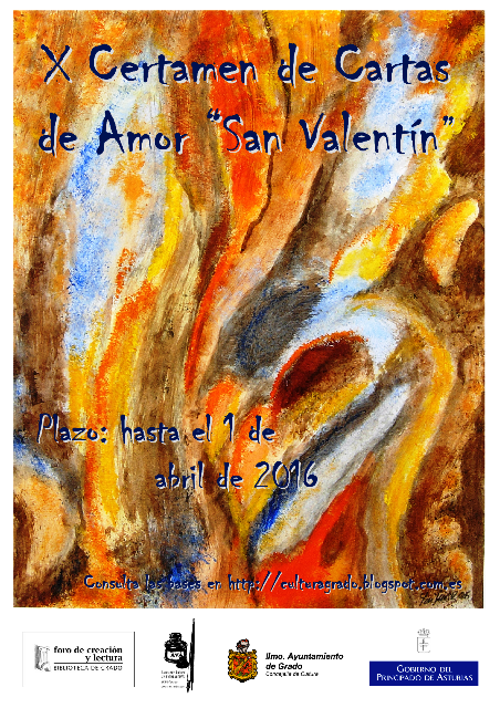 El Foro de Creación y Lectura de la Biblioteca de Grado (Asturias) y la Asociación Cultural Valentín Andrés, con el patrocinio de la Concejalía de Cultura del Ayuntamiento de Grado y La Consejería de Educación y Cultura del Principado de Asturias, convocan el Décimo Certamen Literario de Cartas de Amor San Valentín, con arreglo a las siguientes bases: