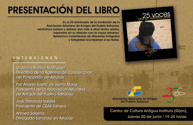 Veinticinco autores han dado vida a otros tantos relatos inspirados en su relación con la causa saharaui, y ventincinco instantáneas de diferentes fotógrafos acompañan los textos que componen el volumen 25 voces por un Sáhara libre, con el que la Asociación Asturiana de Amigos del Pueblo Saharui conmemora su XXV aniversario. Una edición que va a ser presentada este jueves, día 20 de junio, a las 19.30 horas, en la Sala de conferencias del Centro de Cultura Antiguo Instituto de Gijón, en un acto que va contar la presencia de la directora de la Agencia de Cooperación del Principado de Asturias, Graciela Blanco; la presidenta de la Asociación Asturiana de Amigos del Pueblo Saharui, Paz Andrés Saenz de Santa María; el presidente de CEAS-Sahara, José Taboada; y el delegado saharaui en Asturias, Ahmed Salama.
