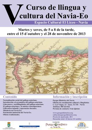La Fundación Parque Histórico del Navia, en collaboración cola Academia de la Llingua Asturiana y el Conceyo de Navia, amaña a las tardes de los martes y xoves entre el 15 d’outubre y el 28 de novembre, la quinta edición del Curso de Llingua y Cultura del Navia-Eo. Este curso forma parte del Plan d’actuacióis de la Oficina Cultural y Llingüística del Parque Histórico del Navia en materia de normalización social del Gallego-Asturiano pa la anualidá de 2013, baxo la tutela de la Dirección Xeneral de Política Llingüística del Principao d’Asturias. Ta aberto xa el prazo de matrícula hasta el prósimo 30 de setembre.