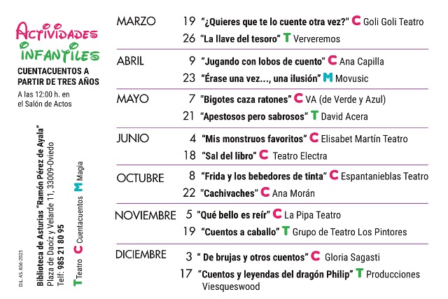 El programa trae a la biblioteca cuentacuentos en los que participan destacados artistas asturianos como Ana Capilla, Goli Goli Teatro, VA (de Verde y de Azul), Teatro Electra, Espantanieblas Teatro, Ana Morán, La Pipa Teatro y Gloria Sagasti. Los cuentacuentos tendrán lugar los domingos 19 de marzo, 9 de abril, 7 de mayo, 4 y 18 de junio, 8 y 22 de octubre, 5 de noviembre y 3 de diciembre.