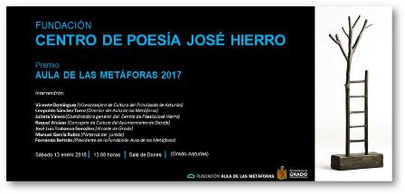 El sábado 13 de enero a las 13:00 horas en la Sala de Dones del Aula de las Metáforas en la Casa de Cultura de Grado tendrá lugar el acto de entrega del Premio Aula de las Metáforas 2017 a la Fundación Centro de Poesía José Hierro.