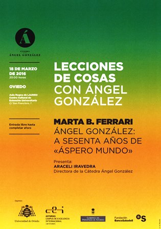 De la mano de la Cátedra Ángel González, la Universidad de Oviedo ofrece, el próximo viernes 18 de marzo a las 20:00 horas en el Aula Magna de LAUDEO, Centro Cultural de Extensión Universitaria (C/ San Francisco, 1; Oviedo), un nuevo acercamiento a la obra del poeta. La invitada será en esta ocasión Marta B. Ferrari , quien disertará sobre Ángel González: a sesenta años de ‘Áspero mundo’. La presentación correrá a cargo de Araceli Iravedra, directora de la Cátedra.