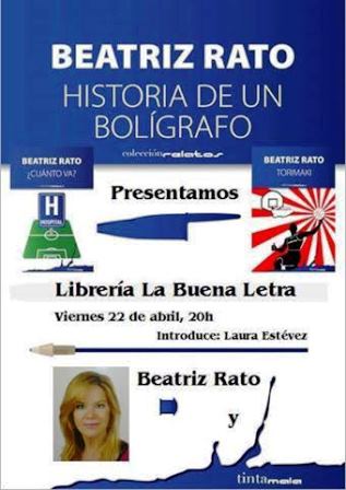 El viernes 22 de abril a las 20:00 horas en la librería de La Buena Letra (Gijón) la escritora gijonesa Beatriz Rato, acompañada por Laura Estévez, presentará sus tres últimos libros juveniles, Historia de un bolígrafo, ¿Cuánto va? y Torimaki.