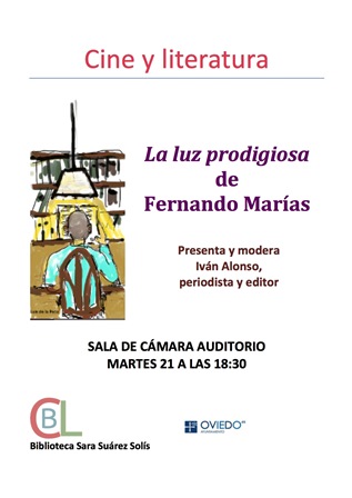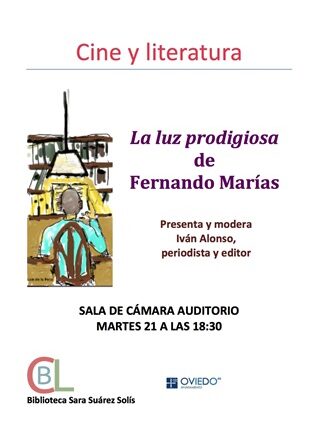 Con motivo del 25 aniversario de la publicación de la primera novela de Fernandez Marías La luz prodigiosa que se ha vuelto a editar incluyendo un genial epílogo del escritor donde narra el inicio y el por qué de la novela, la Biblioteca «Sara Suárez Solís» del Ayuntamiento de Oviedo organiza con los Clubs de Lectura de la misma, una jornada de Cine y Literatura en la que se proyectará la película del mismo nombre y cuyo guión también es obra de F. Marías, y a continuación habrá una tertulia-coloquio sobre novela y película que contará con la presencia del propio Fernando Marías y que estará moderado y presentado por el periodista y editor (ediciones Nobel) Iván Alonso