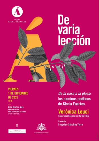 La Cátedra Ángel González, dentro del ciclo De varia lección, ha organizado para el viernes, 1 de diciembre, a las 19:00 horas, en el Aula Rector Alas del Edificio Histórico, la conferencia de Verónica Leuci, titulada “De la casa a la plaza: los caminos poéticos de Gloria Fuertes”, que será presentada por el profesor de la Universidad de Oviedo Leopoldo Sánchez Torre. En esta charla se recorrerá la singular obra de la poeta madrileña Gloria Fuertes (1917-1998), cuyo vigésimo quinto aniversario de su fallecimiento se recuerda este año.