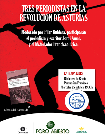 El miércoles 25 octubre a las 19:30 horas en la Biblioteca Pública La Granja de Oviedo, partiendo del libro Tres periodistas en la revolución de Asturias, tendrá lugar un debate en torno a la insurrección obrera ocurrida en Asturias en el mes de octubre de 1934.
