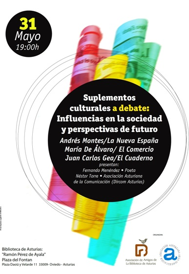 El próximo jueves, 31 de mayo, la Biblioteca de Asturias acogerá una nueva actividad organizada por la Asociación de Amigos de la Biblioteca, que en esta ocasión cuenta también con la colaboración de la Asociación Asturiana de la Comunicación (DIRCOM) para ofrecernos un interesante debate sobre debate sobre las influencias y perspectivas delfuturodel periodismo cultural. Bajo el título Suplementos culturales a debate: influencias en la sociedad y perspectivas de futuro, departirán Andrés Montes, del diario La Nueva España; María de Álvaro, de El Comercio; y Juan Carlos Gea, de El Cuaderno de La Voz de Asturias, con la participación también como moderadores y presentadores de Fernando Menéndez -escritor- y Néstor Torre -vocal de Comunicación de la Asociación Dircom Asturias-.