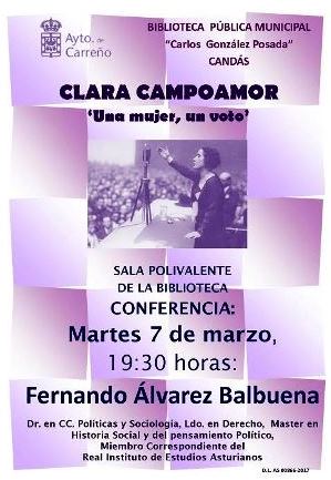 El martes día 7 de marzo a las 19:00 horas en la sala polivalente de la biblioteca tendrá lugar la conferencia: Clara Campoamor: una mujer, un voto a cargo de Fernándo Álvarez Balbuena, doctor en CC. Políticas y Sociología, Ldo. en Derecho, Master en Historia Social y del Pensamiento Político y miembro correspondiente del Real Instituto de Astudios Asturianos.