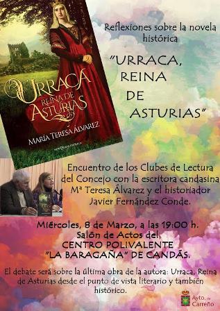 El miércoles día 8 de marzo a las 19:00 horas en el Salón de Actos del Centro Polivalente «La Baragaña» de Candás tendrá lugar un encuentro de los clubes de lectura del Concejo con la escritora candasina Mª Teresa Alvarez y el historiador Javier Fernández Conde. El debate versará sobre la última obra de la autora: Urraca, Reina de Asturias (La esfera de los Libros, 2016 ) desde un punto de vista literario y también histórico.