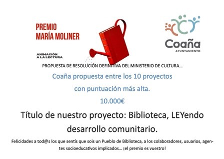 Este año han sido en total doce las bibliotecas asturianas premiadas  en la Campaña de Animación a la Lectura María Moliner para municipios de menos de 50.000 habitantes. Además, uno de los diez  premios María Moliner al mejor proyecto de animación a la lectura en municipios de menos de 5.000 habitantes ha sido concedido al presentado por la Biblioteca de Coaña.