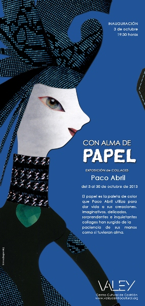 El collage es ya una centenaria técnica artística prestigiada desde sus mismos orígenon papel, le gusta el collage puro, si podemos hablar así; sólo papeles de variadas texturas, algunos reciclados, y sin el auxilio de la pintura. Le gusta subrayar q El Foyer del Teatro del Centro Cultural Valey, de Castrillón, acogerá del 3 al 30 de Octubre la exposición “Alma de Papel”, una muestra de collages del polifacético Paco Abril, comisariada por Ana López Chicano. Con entrada libre y gratuita, será inaugurada este próximo día 3, a las 19’30 horas, en un acto que contará con la presencia del autor. ue, con ese mes por el talento de Picasso y Braque, asumida por los dadaístas y heredada, entre otros, por los cultivadores del «mail-art». A Paco Abril, que también hace escultura caterial y «la lenta paciencia de las manos», quiere llegar al mismo punto que un pintor con sus pigmentos. Y lo consigue”.