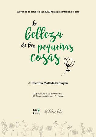 El jueves 31 de octubre a las 20:00 horas en la librería La Buena Letra de Gijón Enedina Mallada Paniagua presentará su libro La belleza de las pequeñas cosas, editado por la editorial TalYCual. Acompañará a la autora Esther Prieto Alonso de Ediciones Trabe.