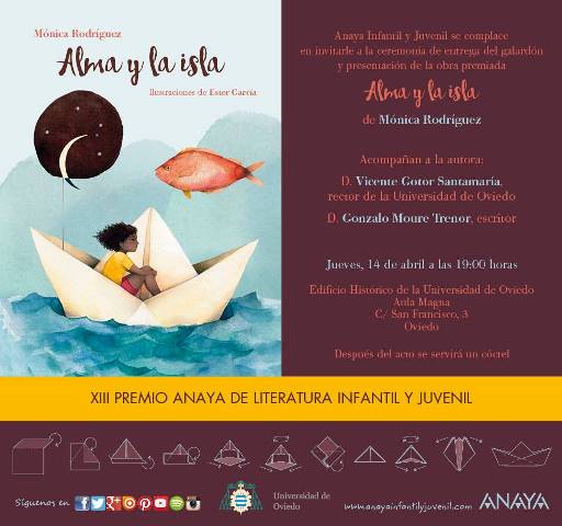 El jueves 14 de abril a las 19:00 horas tendrá lugar la ceremonia de entrega del galardón y presentación de la obra premiada con el XIII Premio Anaya de Literatura Infantil y Juvenil: Alma y la isla de Mónica Rodríguez. El acto tendrá lugar en el Edificio Histórico de la Universidad de Oviedo, Aula Magna (C/ San Francisco, 3). Acompañarán a la autora: Vicente Gotor Santamaría, rector de la Universidad de Oviedo y Gonzalo Moure Trenor, escritor.