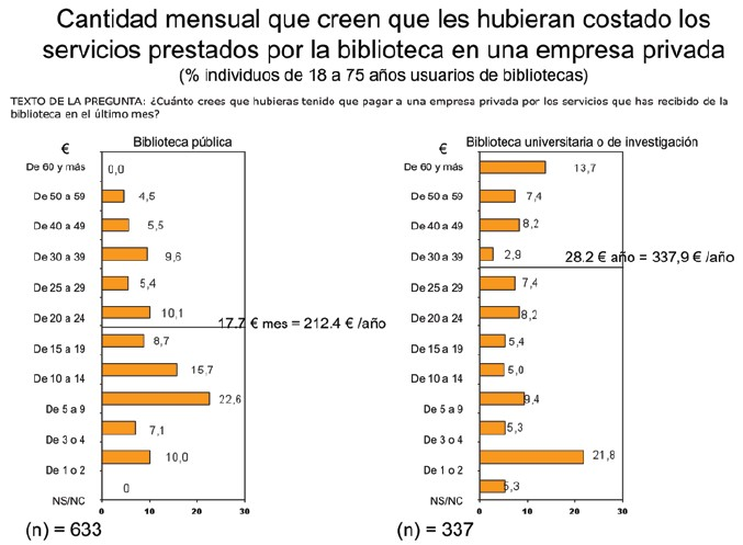 2. Un usuario-tipo de una biblioteca pública valora en 17,7 €/mes los servicios que recibe, préstamo de libros, lectura en las salas, asesoramiento de los bibliotecarios, ayuda para hacer deberes en el caso de los niños, acceso a internet a través de la wifi, asistencia a actividades culturales, etc. Es decir, considera que hubiera tenido que pagar esta cantidad de haber recibido tales servicios de una empresa privada. Un usuario-tipo de una biblioteca universitaria o científica valora que los servicios que esta le presta, si los tuviera que obtener de una empresa privada, tendrían un precio de 28,2 €/mes.