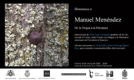 El viernes 13 de marzu, a les 19:30 hores, celébrase na Casa la Cultura de Grau (Sala Polivalente), un homenaxe al llingüista Manuel Menéndez García onde va intervenir Xulio Viejo Fernández, profesor de la Universidá d’Uviéu, con una conferencia titulada “La llingua y la lliteratura asturianes nel Occidente d’Asturies”. L’actu va acabar con un recital de poesía a cargu de Xuan BelloAntón García y Miguel Rojo.