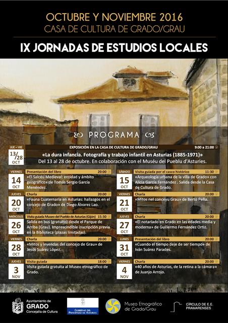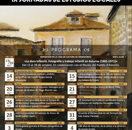 Un año más llegan a Grado las Jornadas de Estudios Locales organizadas por la Concejalía de Cultura, a través del Museo Etnográfico, y el Círculo de Estudios Pramarense. Durante los meses de octubre y noviembre se celebrarán en la Casa de Cultura charlas, presentaciones de libros, visitas guiadas, talleres y otras actividades que tienen como protagonista al concejo de Grado/Grau.