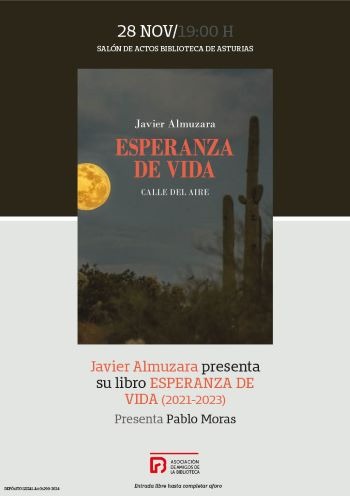 El jueves 28 de noviembre a las 19:00 horas en el salón de actos de la Biblioteca de Asturias “Ramón Pérez de Ayala” Javier Almuzara presentará su libro Esperanza de vida. El acto organizado por la Asociación de Amigos de la Biblioteca de Asturias contará con la participación de Pablo Moras.