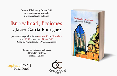 El martes 12 de diciembre a las 20:00 horas en el Ópera Café (C/ Argüelles, 35 Oviedo) tendrá lugar la presentación de En realidad, ficciones de Javier García Rodríguez. El autor estará acompañado de Alejandro Basteriro y Marta Magadán.