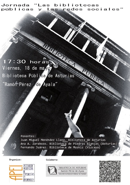 Este viernes, 18 de mayo, a las 17,30h., el Salón de Actos de la Biblioteca de Asturias acogerá la Jornada «Las Bibliotecas Públicas y las redes sociales», organizada por APEI (Asociación Profesional de Espacialistas en Información), con acceso libre y gratuito.