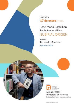 El jueves 17 de enero a las 19:00 horas en el salón de actos de la Biblioteca de Asturias «Ramón Pérez de Ayala» José María Castrillón hablará sobre su libro Subir al origen : antología comentada de poesía occidental no hispánica (1800-1941). El acto organizado por la Asociación de Amigos de la Biblioteca de Asturias contará con la participación del escritor Fernando Menéndez.