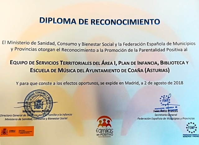 El Ministerio de Sanidad, Consumo y Bienestar Social y la Federación Española de Municipios y Provincias han remitido este Diploma de Reconocimiento a la Parentalidad Positiva a la Biblioteca Municipal de Coaña “Gonzalo Anes”. Distingue así los esfuerzos de varios servicios que han elaborado un plan de mejora con la finalidad de mejorar el bienestar del municipio apoyando a las familias, teniendo en cuenta los Derechos de la Infancia.