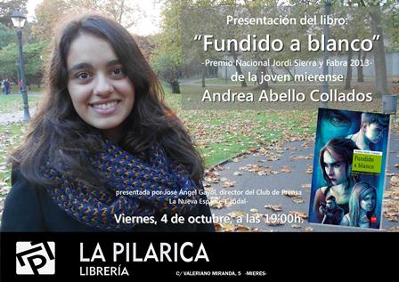 El próximo viernes, 4 de octubre, a las 19h., la joven Andrea Abello Collados presentará en la librería mierense La Pilarica (C/ Valeriano Miranda,5), la novela con la que se ha alzado con el Premio Jordi Sierra i Fabra para Jóvenes: Fundido a blanco, publicada por la editorial SM. En el acto estará acompañada por el escritor y poeta Jose Ángel Gayol, director del Club de Prensa de La Nueva España–Caudal.
