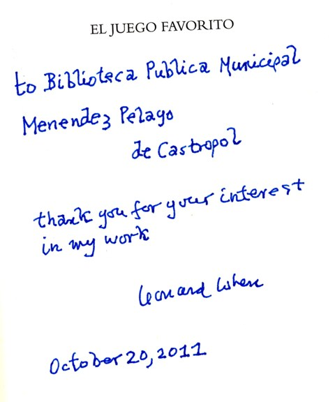 “To Biblioteca Publica Municipal Menendez Pelayo de Castropol thank you for your interest in my work”