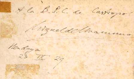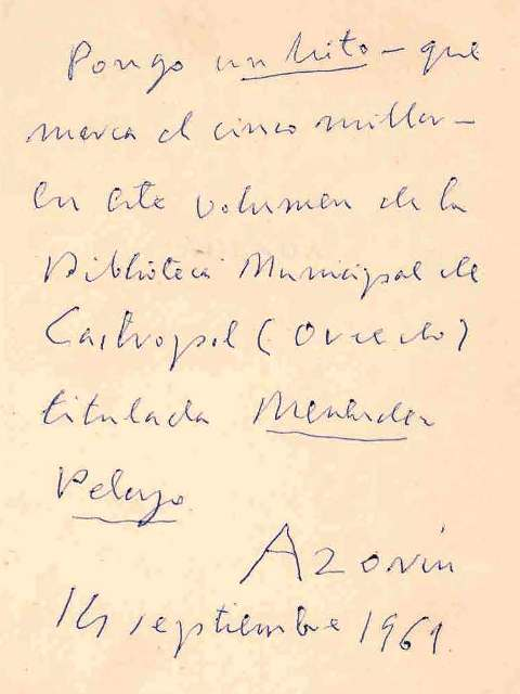 “A la Biblioteca popular Menéndez Pelayo de Castropol. Muy cordialmente”