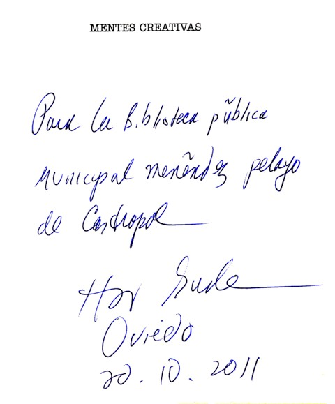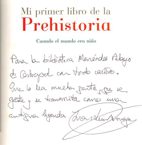 De esta forma dedicó a la biblioteca Mi Primer libro de la Prehistoria: cuando el mundo era niño“Para la biblioteca Menéndez Pelayo de Castropol con todo cariño. Que lo lea mucha gente, que se gaste y se transmita como una antigua leyenda”.