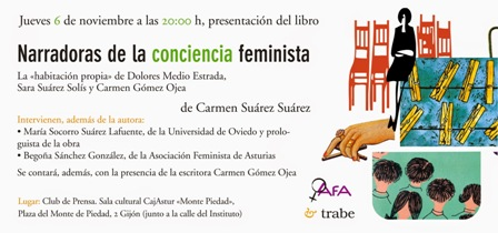 El jueves 6 de noviembre, a las 20:00 horas, Carmen Suárez presenta en el Club de Prensa de La Nueva España de Gijón (Sala Cultural Cajastur “Monte de Piedad”, Plaza del Monte de Piedad, 2) el libro Narradoras de la conciencia feminista. La “habitación propia” de Dolores Medio Estrada, Sara Suárez Solís y Carmen Gómez Ojea, que publica la editorial Trabe.