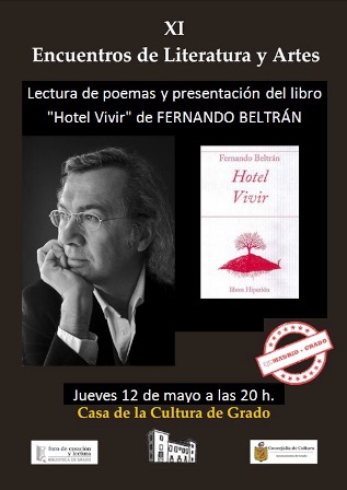 El jueves 12 de mayo a las 20:00 horas tendrá lugar la lectura de poemas y presentación del libro Hotel Vivir de Fernando Beltrán. Esta actividad se enmarca en los XI Encuentros de Literatura y Artes que organiza la Concejalía de Cultura del Ayuntamiento de Grado/Grau y El Foro de Creación y Lectura de la Biblioteca y se realiza en la Casa de Cultura.