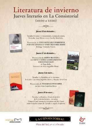 Dicen que el invierno nos vuelve perezosos, la falta de luz y el frío nos resta ganas para salir de casa, pero también aseguran que en los países donde predomina la lluvia es donde más se lee. Con esta filosofía, mezcla de verdad y esperanza, el escritor Josu Monterroso, en plena promoción de su reciente novela Dormitorios de colores (Ediciones Trabe), ha creado «Literatura de invierno» un ciclo de encuentros literarios que se realiza todos los jueves de 20’00 a 22’00 h., en la vinoteca La Consistorial de la Plaza del Pescado (Oviedo). En tiempos de crisis para la cultura, es momento de aunar fuerzas y luchar, así lo entienden Monterroso y las editoriales asturianas Septem y Trabe, que colaboran activamente en la creación de este ciclo literario.