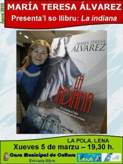 El jueves 5 de marzo, a las 19:30 horas, la Casa Municipal de Cultura de Lena acoge la presentación de La indiana, la última novela de la periodista y escritora asturiana María Teresa Álvarez publicada por la editorial La Esfera de los Libros.