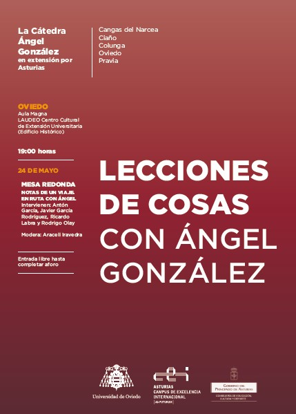 Como cierre de la primera edición del ciclo de conferencias “Lecciones de cosas. Con Ángel González”, que ha organizado la Cátedra Ángel González de la Universidad de Oviedo, los cuatro conferenciantes que han hablado sobre distintos aspectos de la obra del poetaen diversas localidades asturianas (Cangas del Narcea, Ciaño, Colunga, Oviedo, Pravia) se reúnen en una mesa redonda en la que compartiránsu experiencia como lectores y como estudiosos del autor de Palabra sobrepalabra.