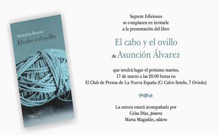 El Club de Prensa de la Nueva España acoge el martes, 17 de marzo, a las 20:00 horas, la presentación de El cabo y el ovillo, nuevo libro de poemas de la escritora madrileña de origen asturiano, Asunción Álvarez. En el acto para dar a conocer esta obra, que ha sido editada por Septem Ediciones, estará presente, además de la autora, su editora, Marta Magadán y la pintora Celsa Díaz.
