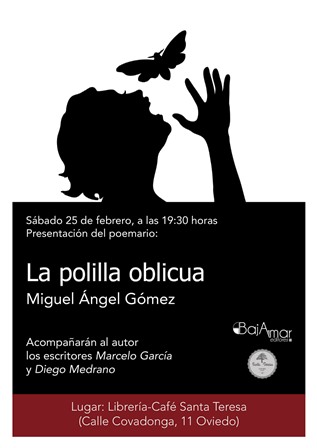 El sábado 25 de febrero a las 19:30 horas en Santa Teresa Librería-Café tendrá lugar la presentación del poemario La polilla oblicua de Miguel Ángel Gómez. Acompañarán al autor los escritores Marcelo García y Diego Medrano.