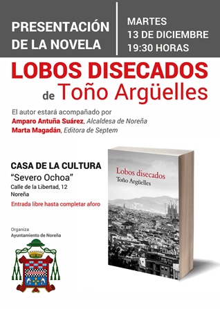 Mañana, martes 13 de diciembre, la Casa de la Cultura de Noreña acogerá la presentación de la novela Lobos disecados de Toño Argüelles. La cita será a las 19:30 horas y el autor estará acompañado por la Alcaldesa de Noreña, Amparo Antuña y la editora, Marta Magadán.