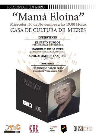 El miércoles 30 de noviembre a las 19:00 horas en la Casa de Cultura de Mieres tendrá lugar la presentación de Mamá Eloína, primera obra literaria del mierense Carlos Barros, exdirector de Radio Parpayuela.