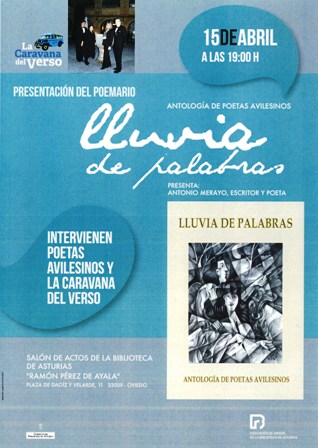 El miércoles 15 de abril a las 19:00 horas en el Salón de Actos de la Biblioteca de Asturias «Ramón Pérez de Ayala», sita en la Plaza Daoíz y Velarde, 11 (Oviedo) tendrá lugar el acto de presentación del poemario, LLuvia de Palabras: antología de poetas avilesinos, que ha sido editado por Nieva ediciones. El acto será presentado por Antonio Merayo, escritor y poeta e intervendrán poetas avilesinos y La Caravana del Verso.