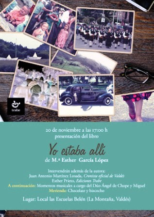 El domingo 20 de noviembre a las 17:00 horas en Local las Escuelas Belén (La Montaña, Valdés) presentación del libro Yo estaba allí de M.ª Esther García López. Intervendrán además de la autora: Juan Antonio Martínez Losada, Cronista oficial de Valdés,Esther Prieto, Ediciones Trabe. A continuación: momentos musicales a cargo del Dúo Ángel de Chope y Miguel. Merienda: Chocolate y bizcocho