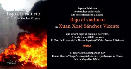 Xuan Xosé Sánchez Vicente presentará su nueva novela Bajo el viaducto, publicada por Septem Ediciones, el próximo miércoles 15 de abril a las 20:00 horas en el Club de Prensa de La Nueva España. En el acto intervendrán, junto con Xuan Xosé Sánchez Vicente: Emilio Huerta “Triqui”, Concejal de IU en el Ayuntamiento de Oviedo y Marta Magadán, editora.